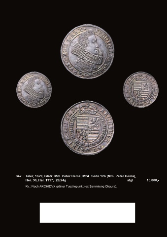 347 Taler, 1629, Glatz, Mm. Peter Hema, MzA. Seite 126 (Mm. Peter Hema), Her. 30, Hal. 1317, 28,94g stgl 15.000,- Rv.: Nach ARCHIDVX grüner Tuschepunkt (ex Sammlung Chaura).