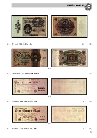 813 813 500 Mark 1923, Ro.DEU-146b I-II 50,- 814 814 Deutschland - 1000 Reichsmark 1924 (“R“) I 100,- 815 815 Eine Billion Mark 1924, Ro.DEU-155a I- 50,- 816 816 Eine Billion Mark 1924, Ro.DEU-155b II 50,- 59