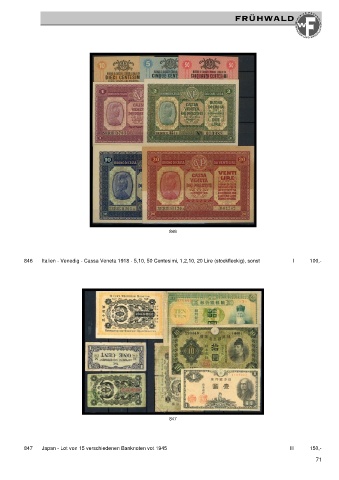846 846 Italien - Venedig - Cassa Veneta 1918 - 5,10, 50 Centesimi, 1,2,10, 20 Lire (stockfleckig), sonst I 100,- 847 847 Japan - Lot von 15 verschiedenen Banknoten vot 1945 III 150,- 71