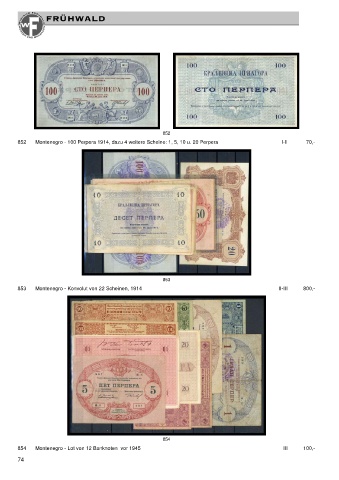 852 852 Montenegro - 100 Perpera 1914, dazu 4 weitere Scheine: 1, 5, 10 u. 20 Perpera I-II 70,- 853 853 Montenegro - Konvolut von 22 Scheinen, 1914 II-III 800,- 854 854 Montenegro - Lot von 12 Banknoten vor 1945 III 100,- 74