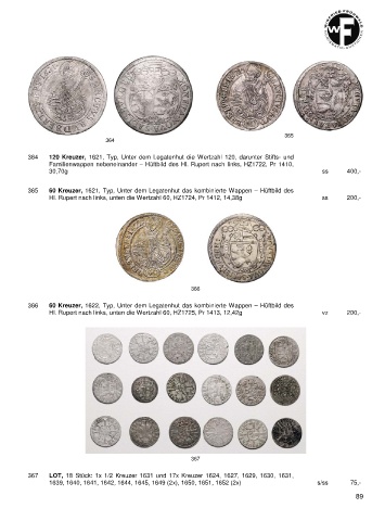 365 60 Kreuzer, 1621, Typ, Unter dem Legatenhut das kombinierte Wappen – Hüftbild des