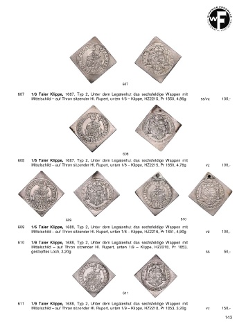 609 1/6 Taler Klippe, 1688, Typ 2, Unter dem Legatenhut das sechsfeldige Wappen mit