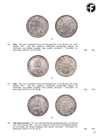 720 Taler, 1738, Typ 2, Brustbild Firmians mit Allongeperücke in der Mozetta nach rechts,
