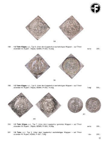 198 1/2 Taler Klippe, o.J., Typ 6, Unter dem Legatenhut sechsfeldiges Wappen – auf Thron